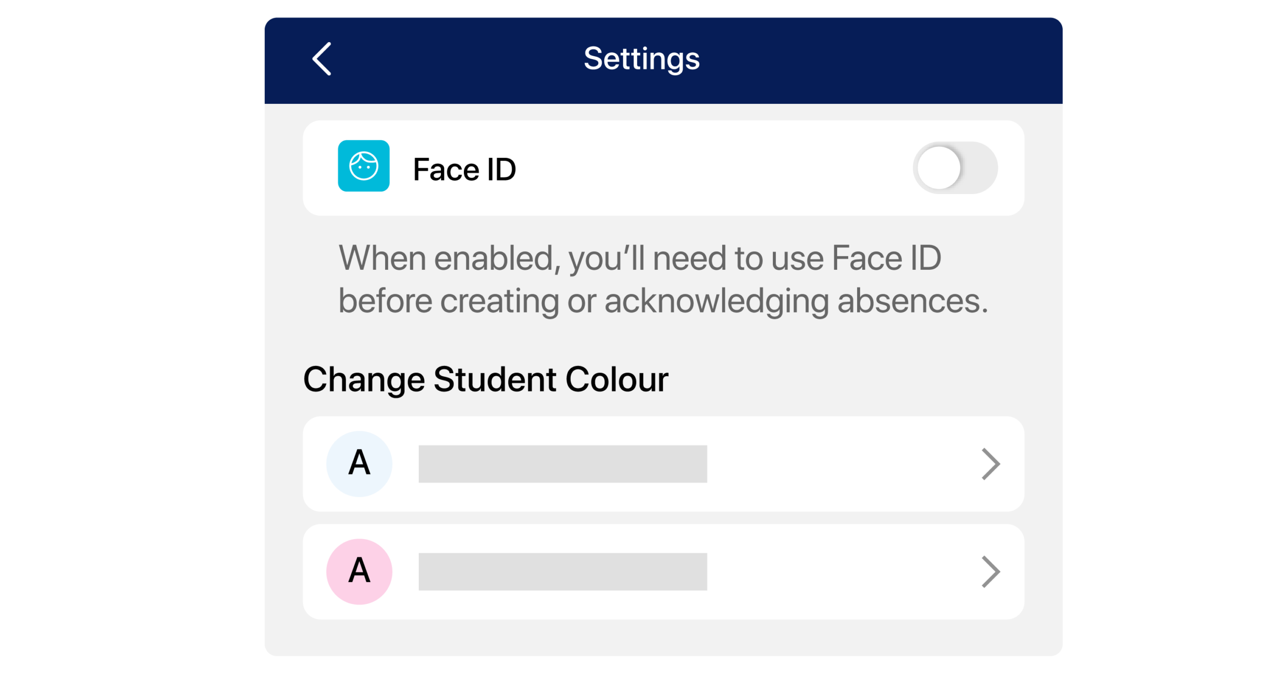 If desired you can access Settings to set up Face ID for absence submissions, and change the student colour if you have more than one daughter attending the school.