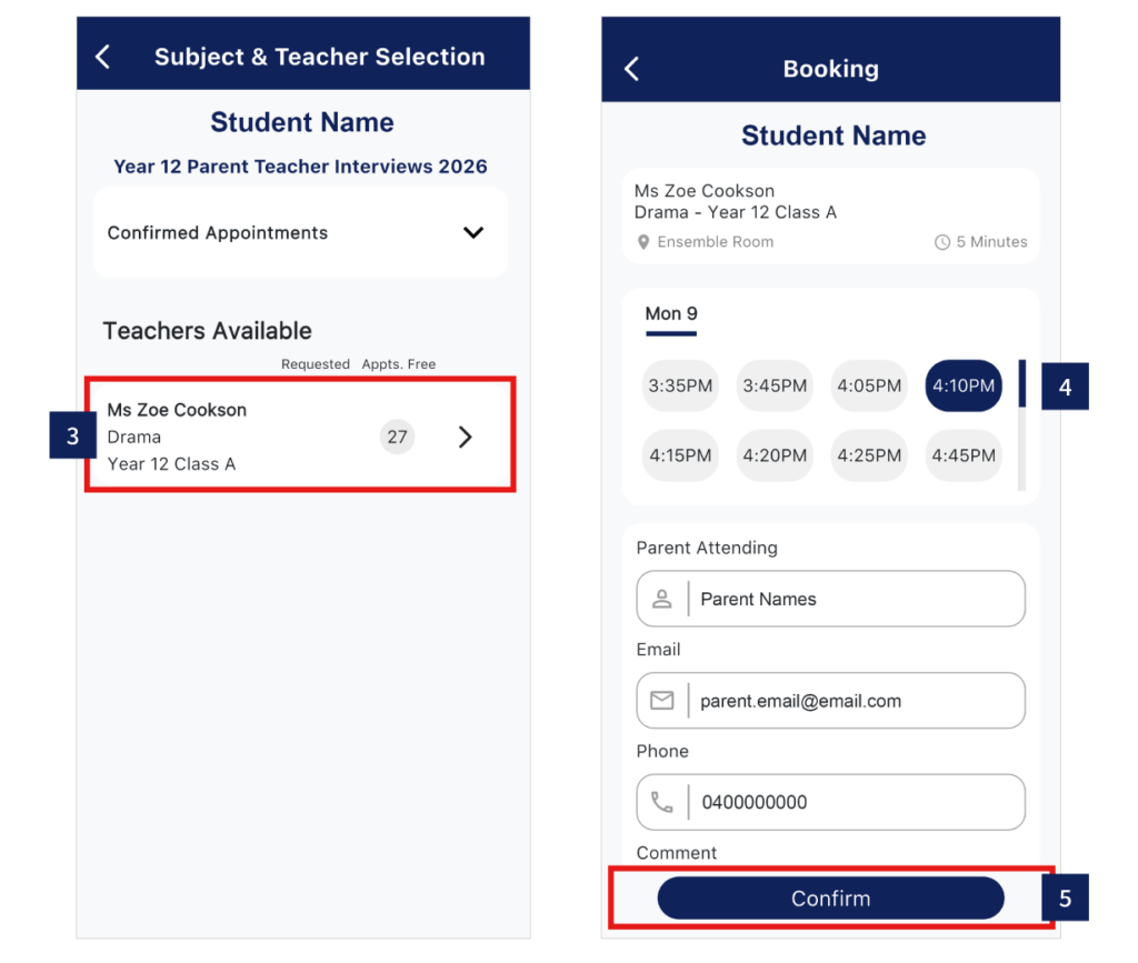 5. Click ‘Confirm’ button, and repeat process until you have booked all your appointments.