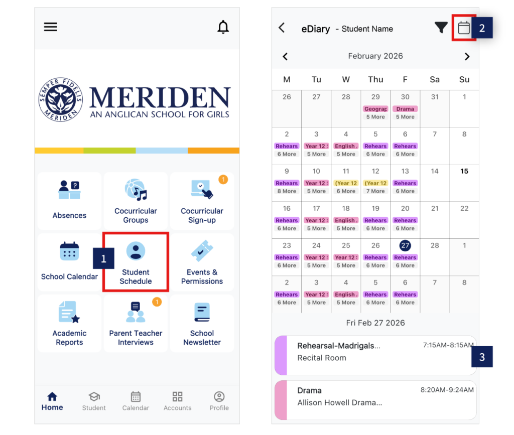 3. Scroll down for your daughter’s daily schedule: classes (Senior School), cocurricular activities and school events.